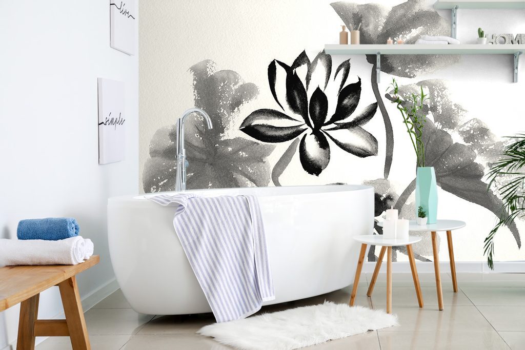 Samolepící tapeta černobílý lotosový květ v akvarelovém provedení
