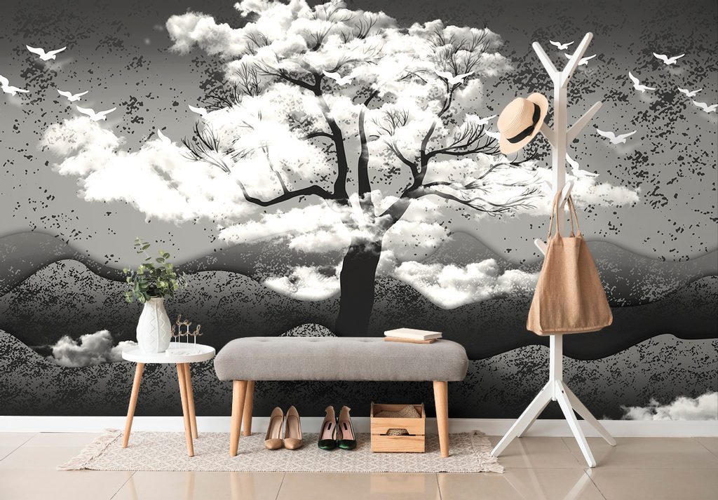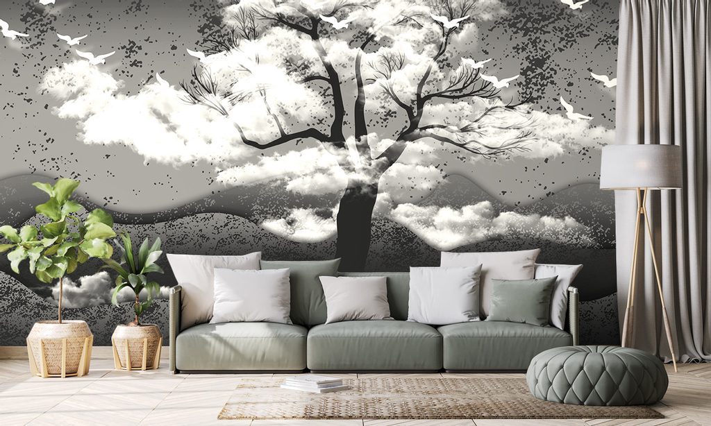 Samolepící tapeta černobílý strom v oblacích