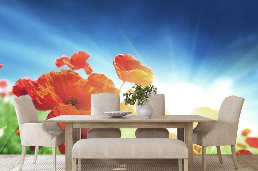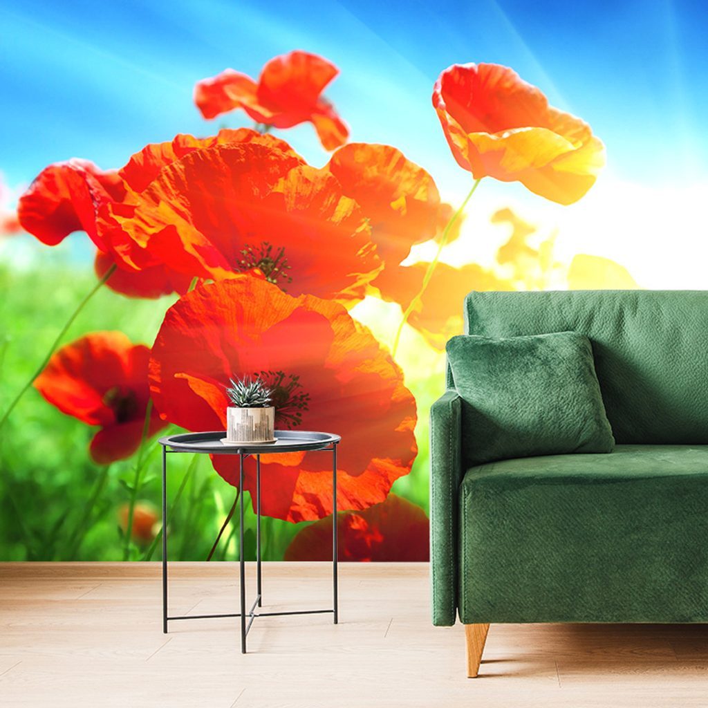 Samolepící tapeta divoký mák s paprsky slunce