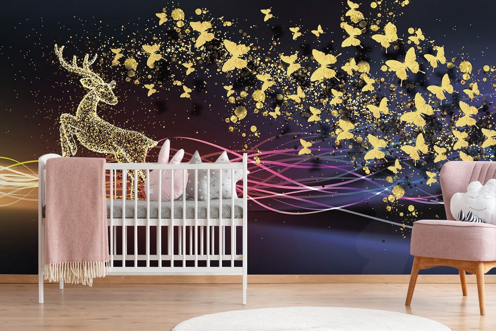 Samolepící tapeta jelen se zlatými motýly