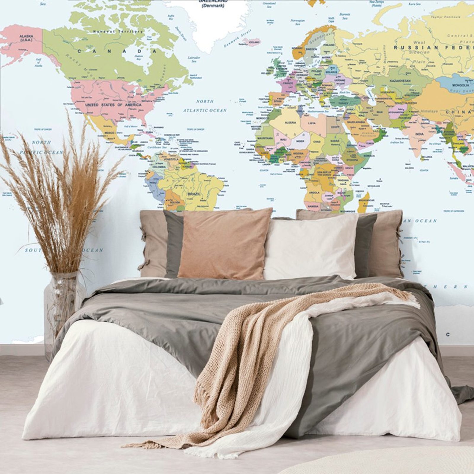 Samolepící tapeta mapa světa se symbolickými zvířaty na dřevěném podkladu