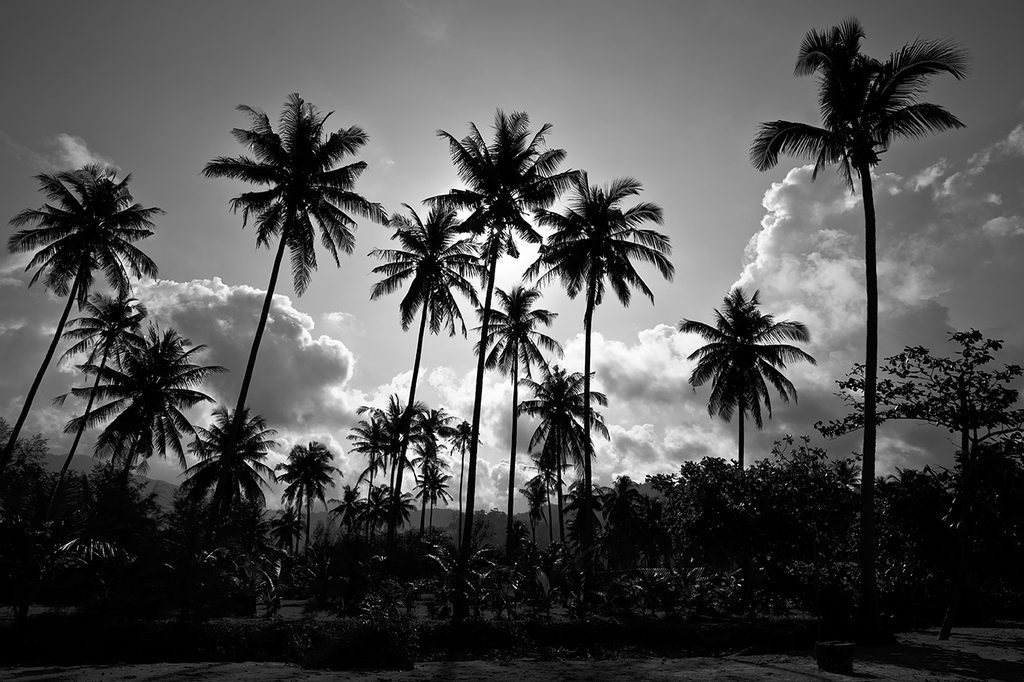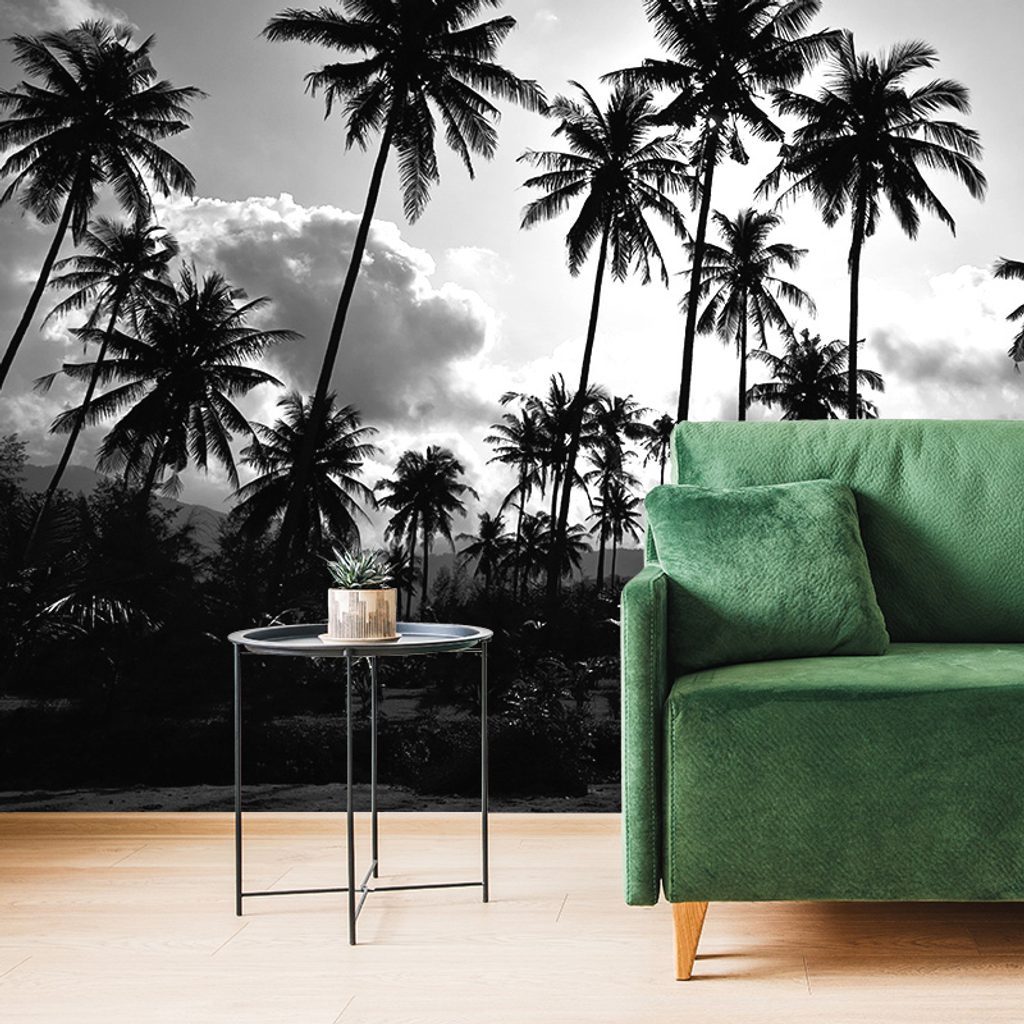 Samolepící tapeta kokosové palmy v záři slunce v černobílém provedení