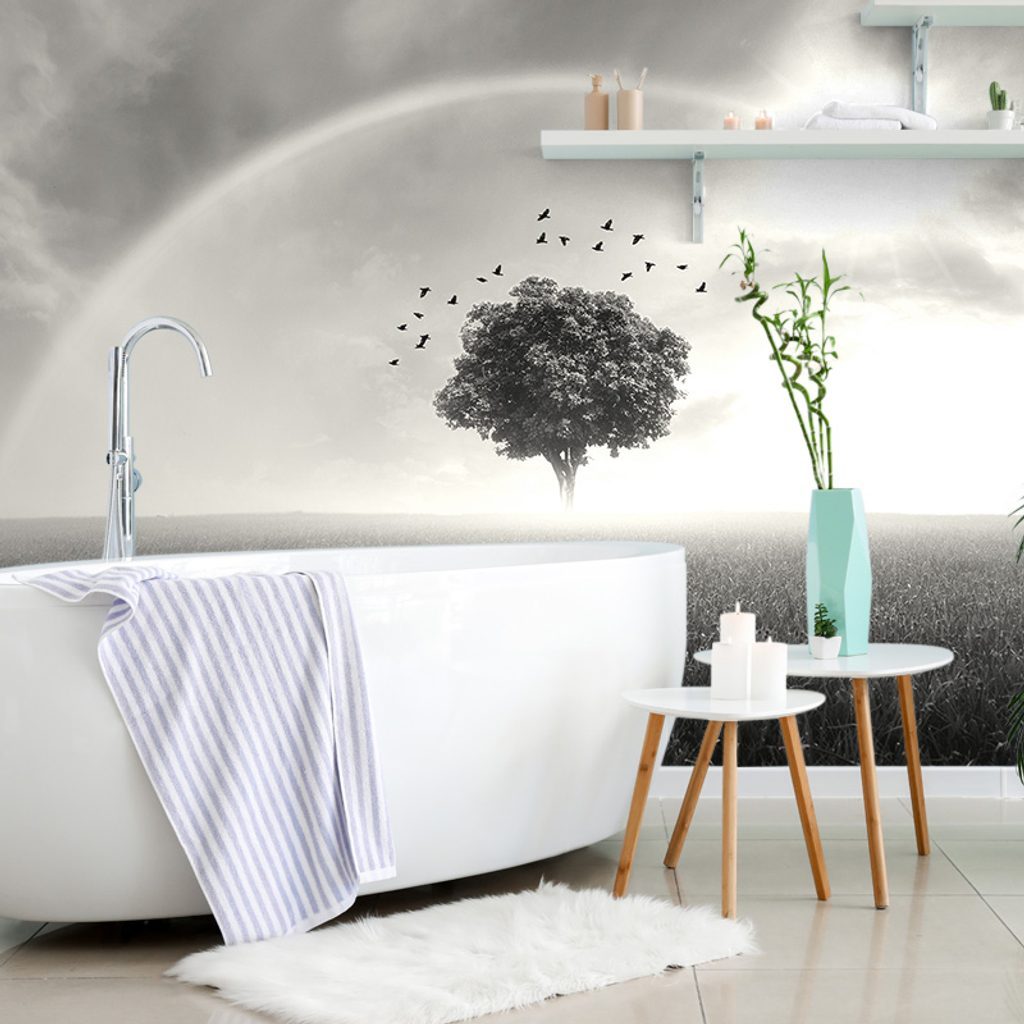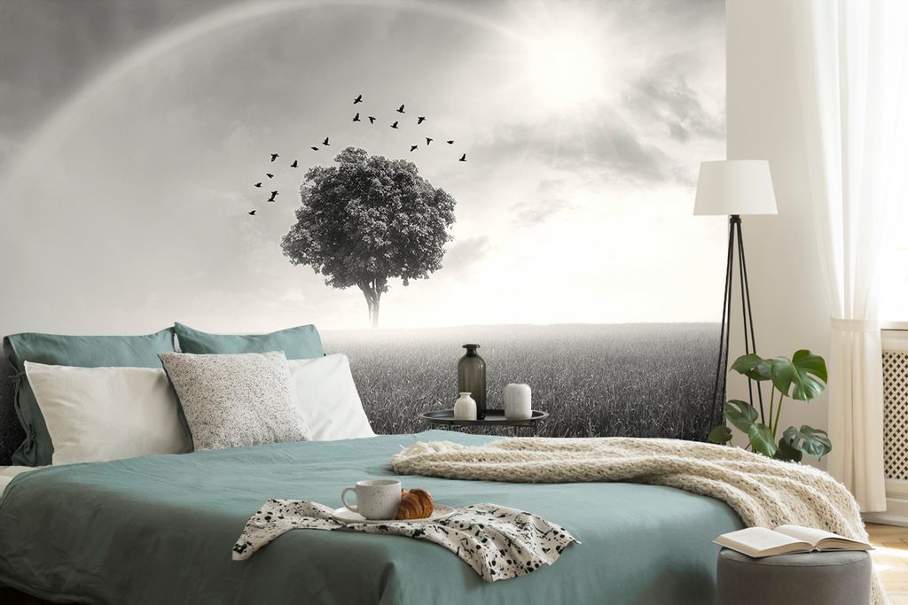Samolepící tapeta magický strom pod duhou v černobílém provedení