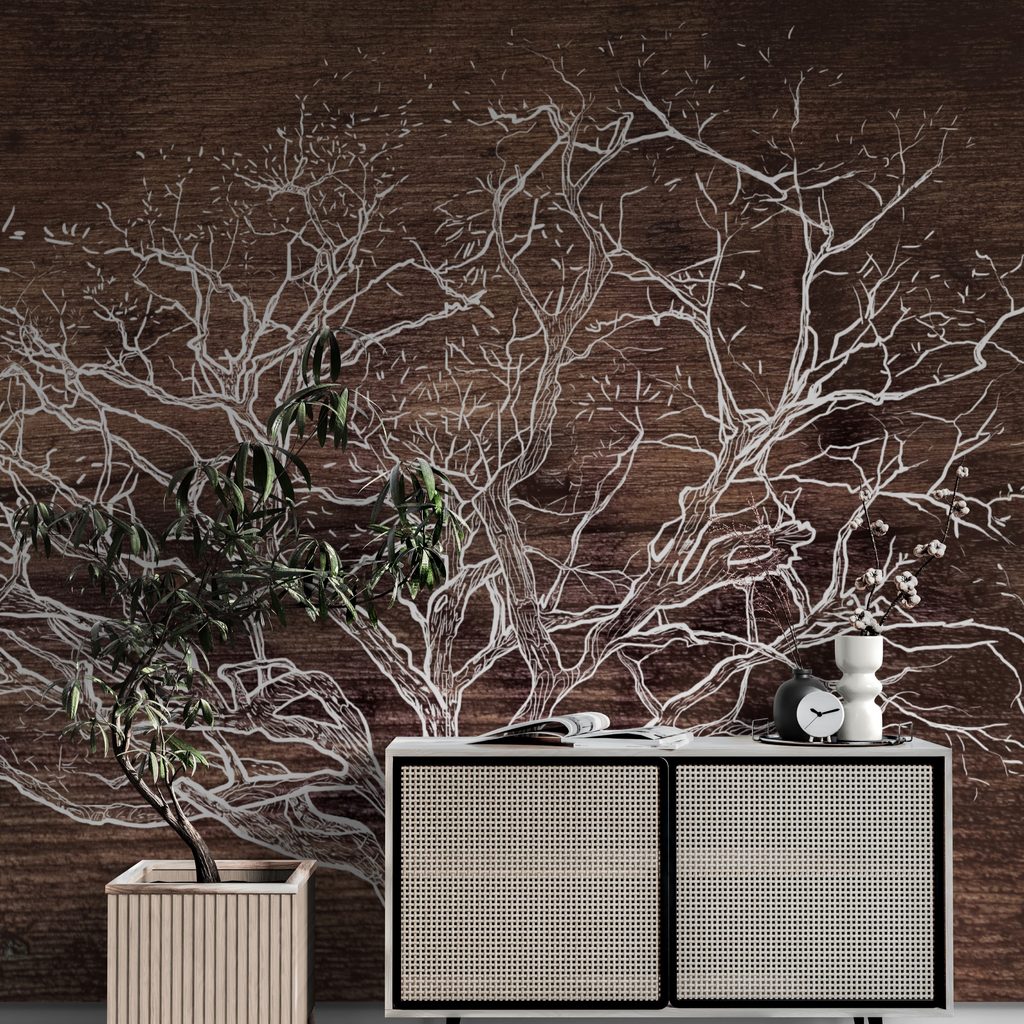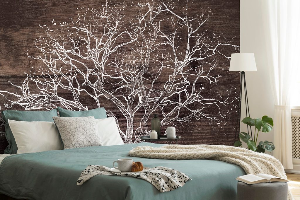 Samolepící tapeta majestátní koruna stromu na dřevěném pozadí