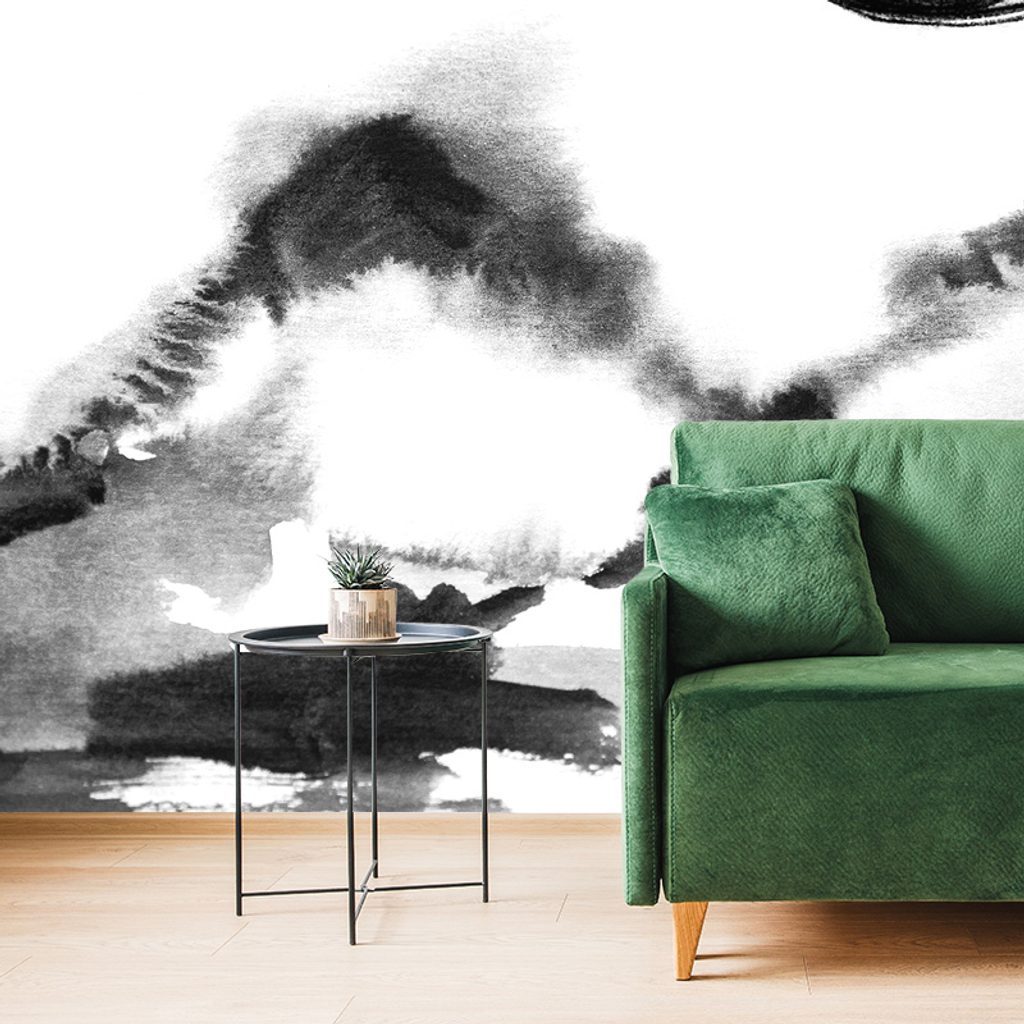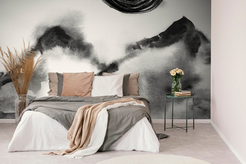 Samolepící tapeta malba japonských hor v černobílém provedení