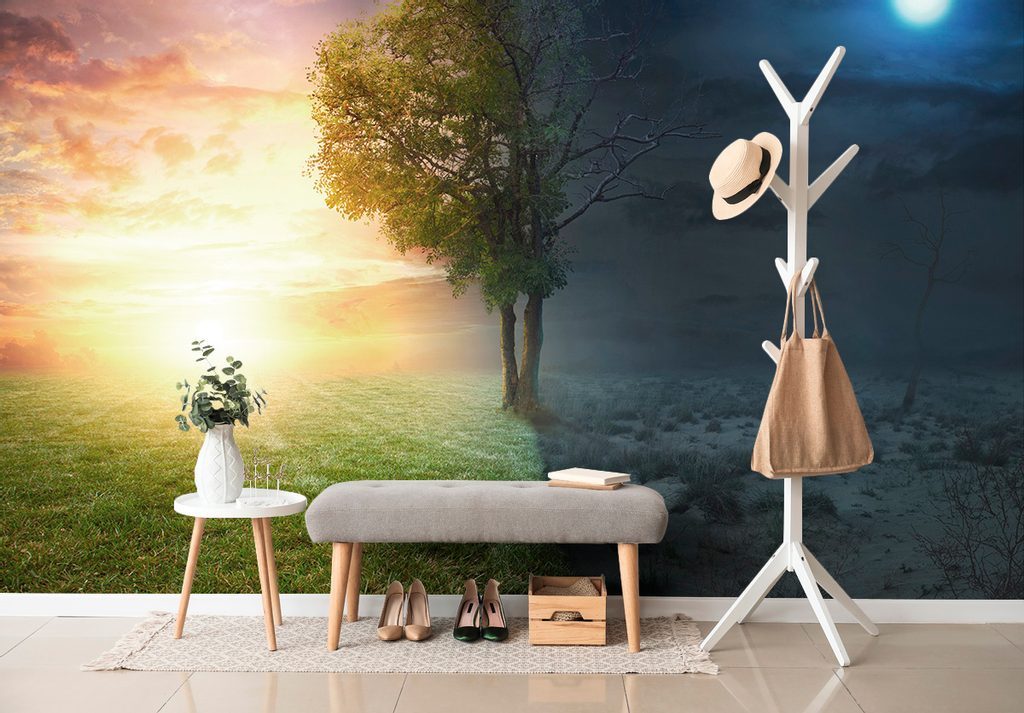Samolepící tapeta magický strom pod duhou v černobílém provedení