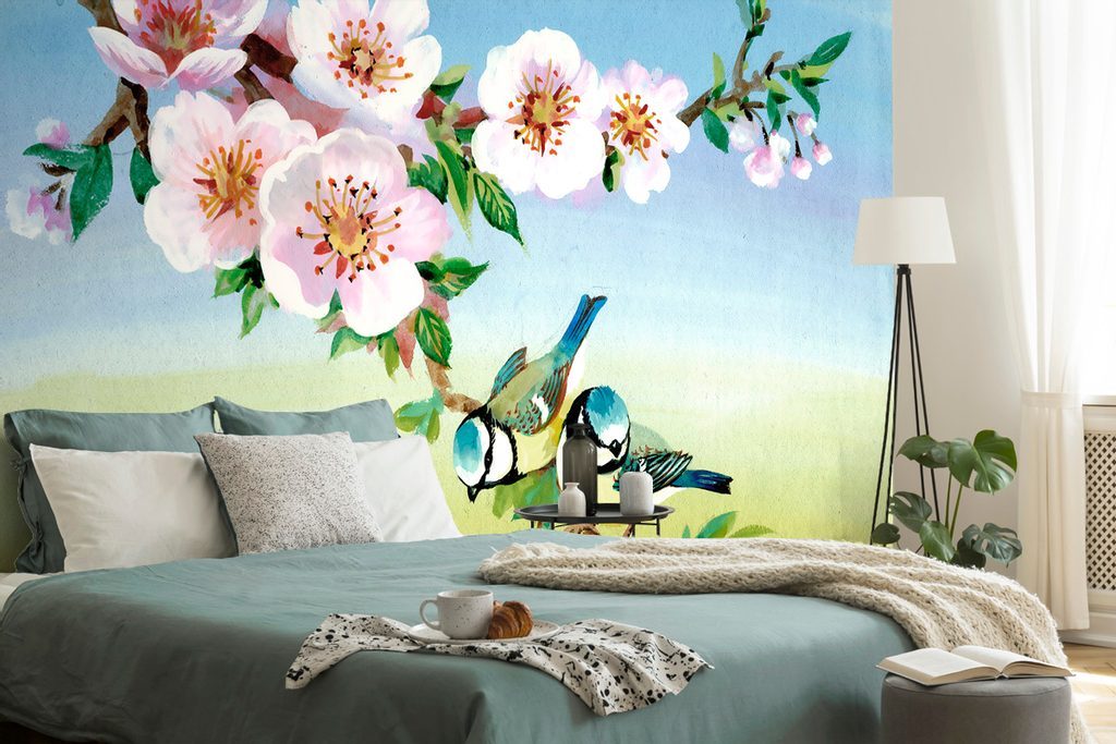 Samolepící tapeta sýkorky sedící na větvičku s květinami