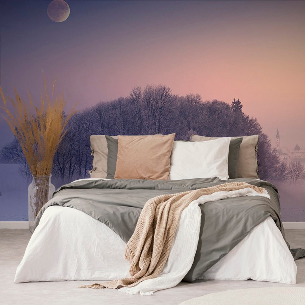 Samolepící tapeta úplněk nad zamlženou vesničkou