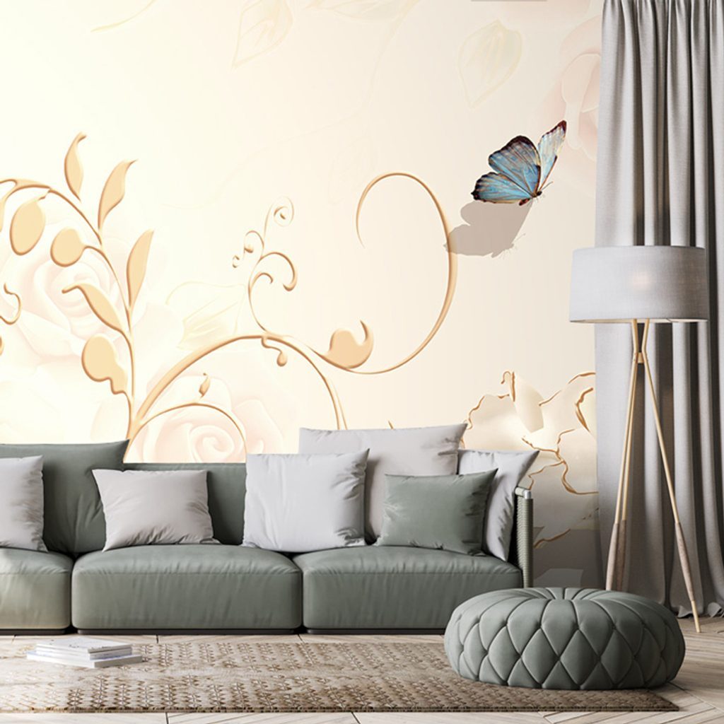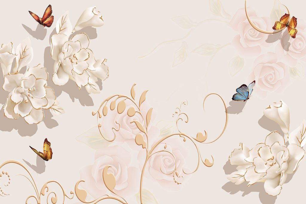 Samolepící tapeta zátiší s květinami a motýly ve vintage stylu
