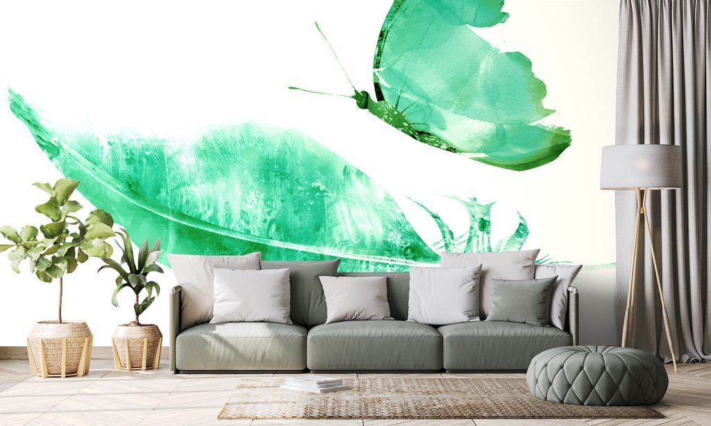 Samolepící tapeta zelený motýl s pírkem