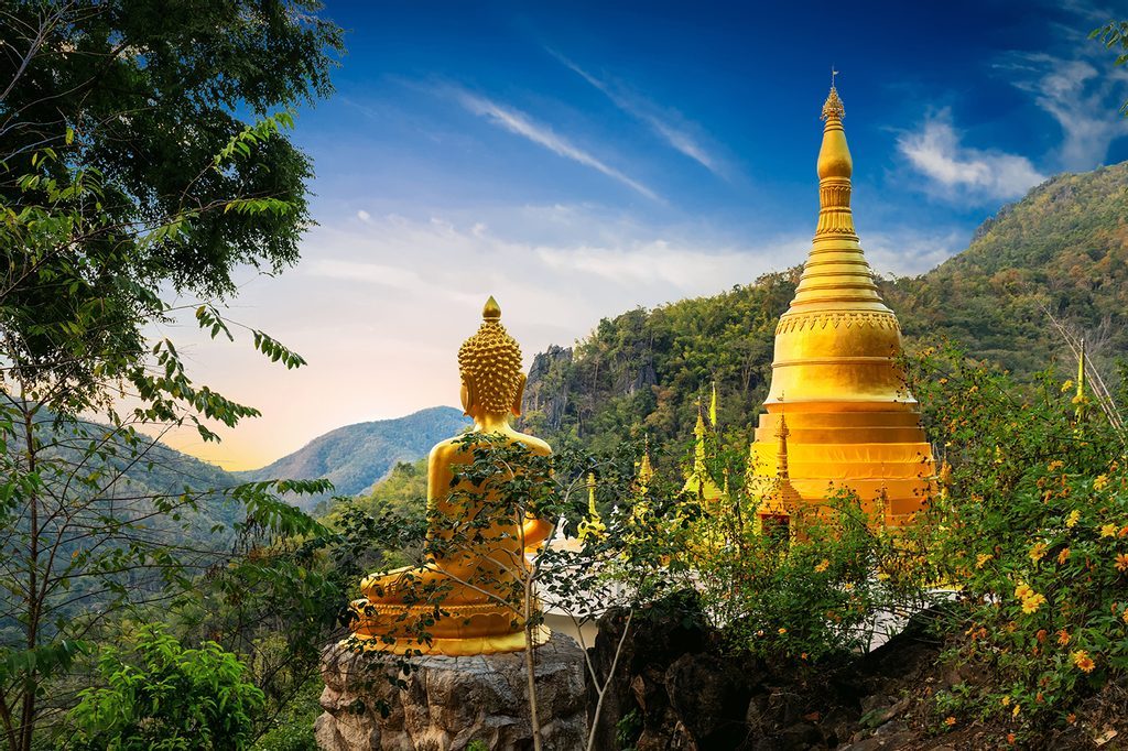 Samolepící tapeta zlatý Buddha obklopen stromy