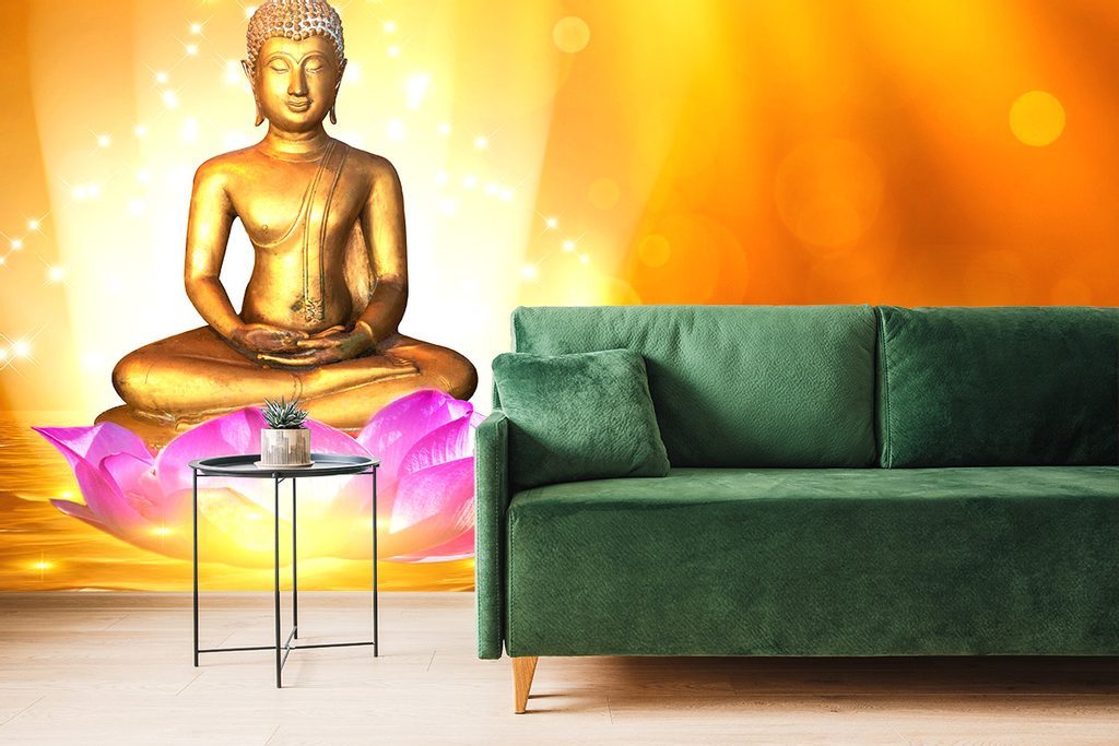 Samolepící tapeta zlatý Buddha s lotosovými květinami