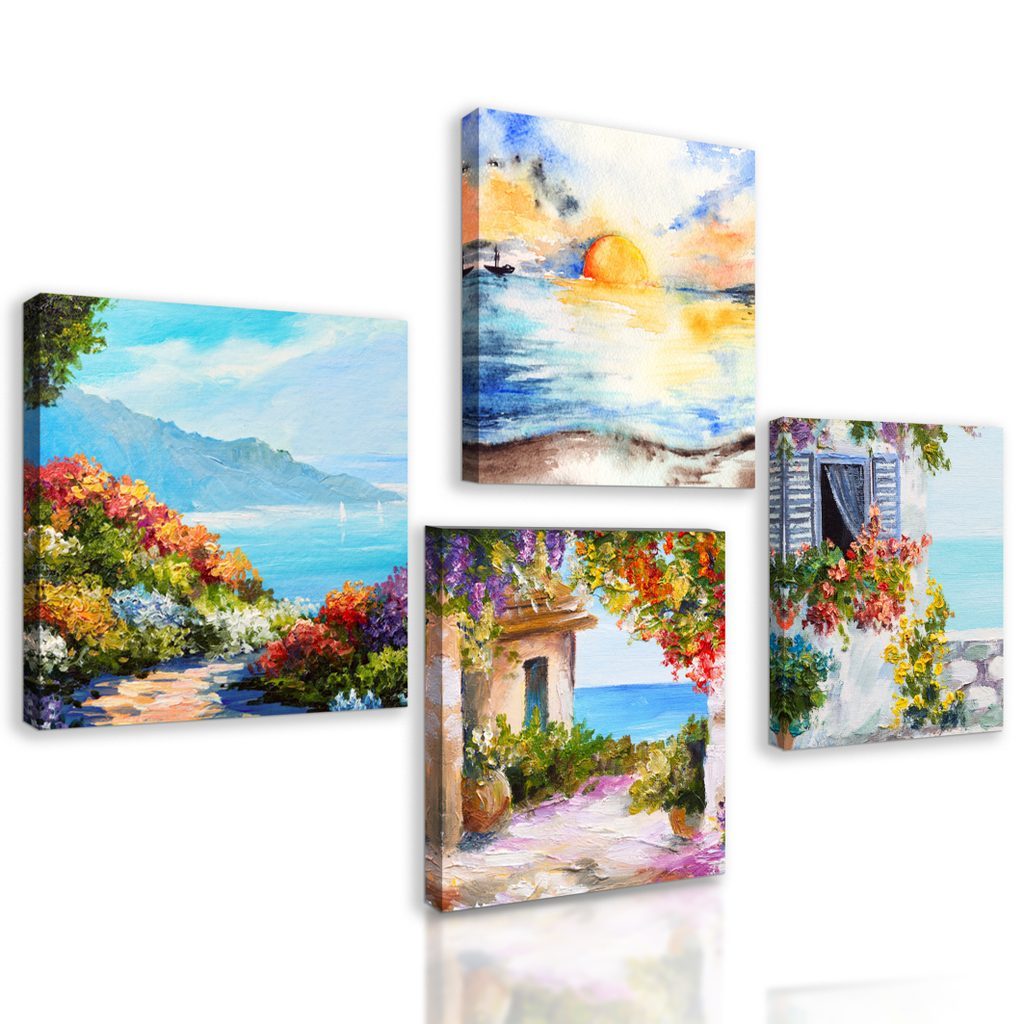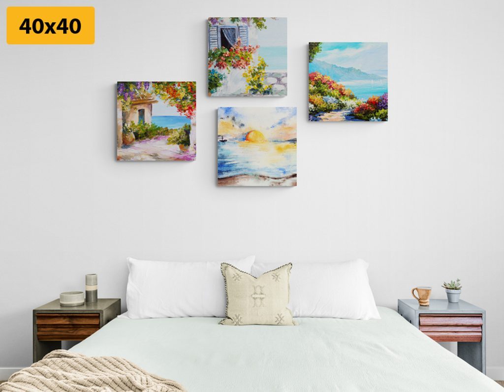 Výhody USP sety Čtyři obrazy laděné do podobných motivů a barev, Snadná instalace, Možnost umístění dle vlastních představ, Prémiové plátno 280 g/m²