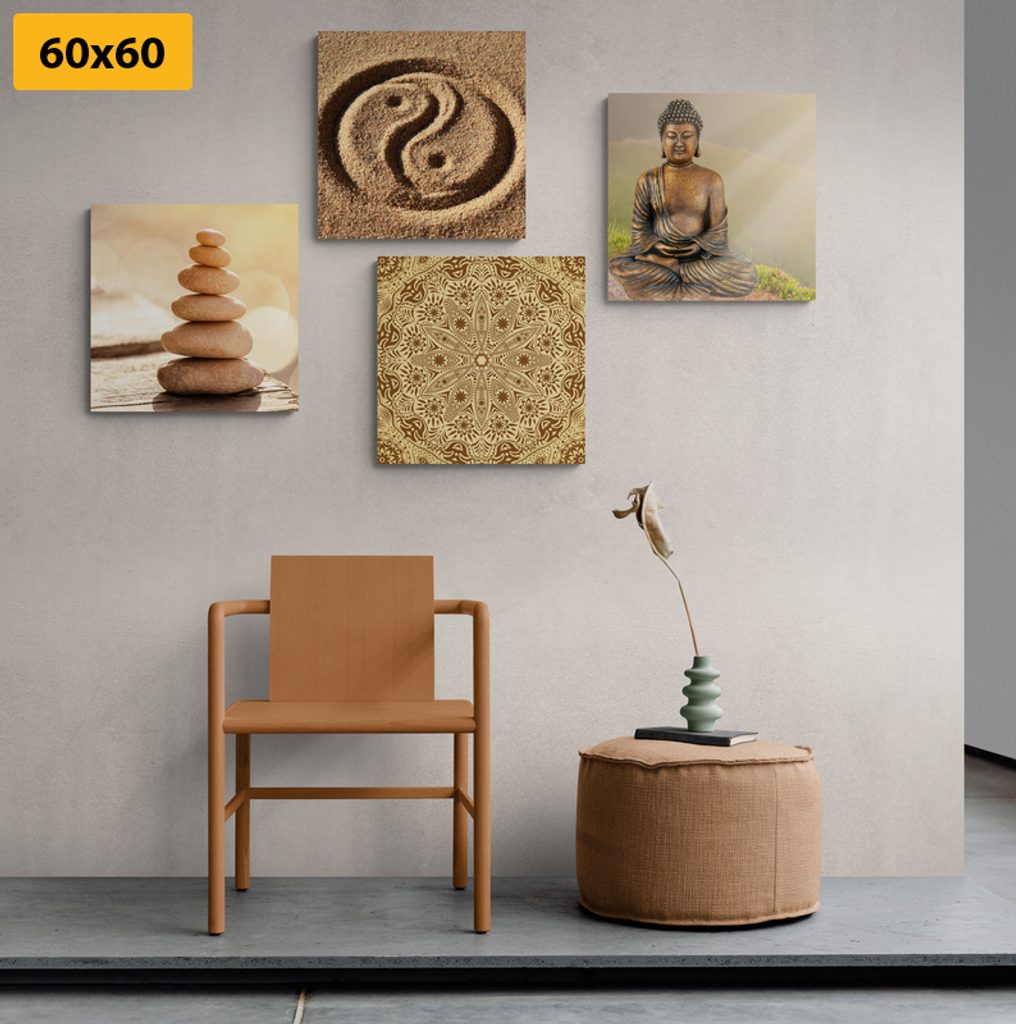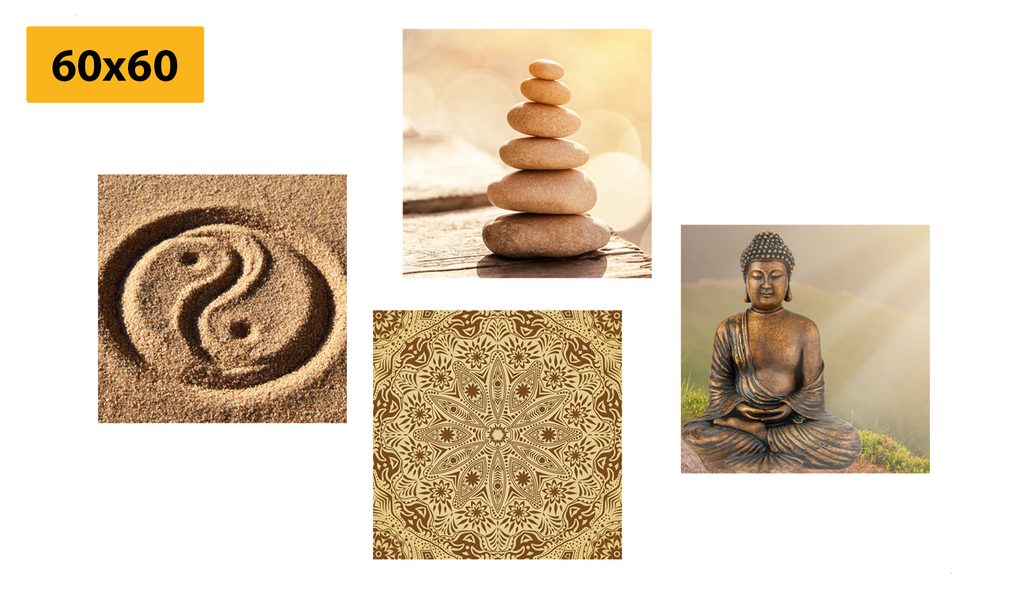 Výhody USP sety Čtyři obrazy laděné do podobných motivů a barev, Snadná instalace, Možnost umístění dle vlastních představ, Prémiové plátno 280 g/m²