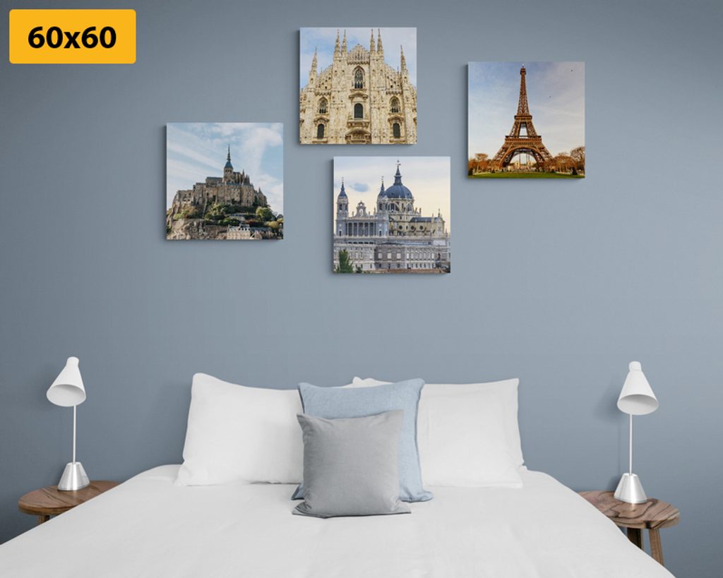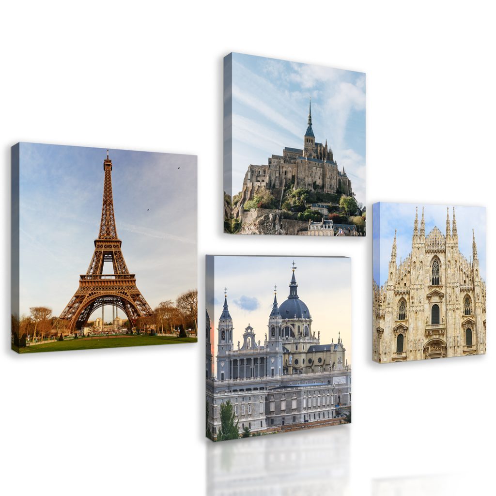Výhody USP sety Čtyři obrazy laděné do podobných motivů a barev, Snadná instalace, Možnost umístění dle vlastních představ, Prémiové plátno 280 g/m²