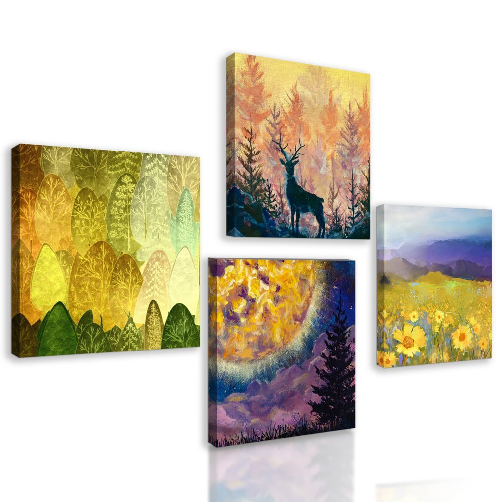 Výhody USP sety Čtyři obrazy laděné do podobných motivů a barev, Snadná instalace, Možnost umístění dle vlastních představ, Prémiové plátno 280 g/m²