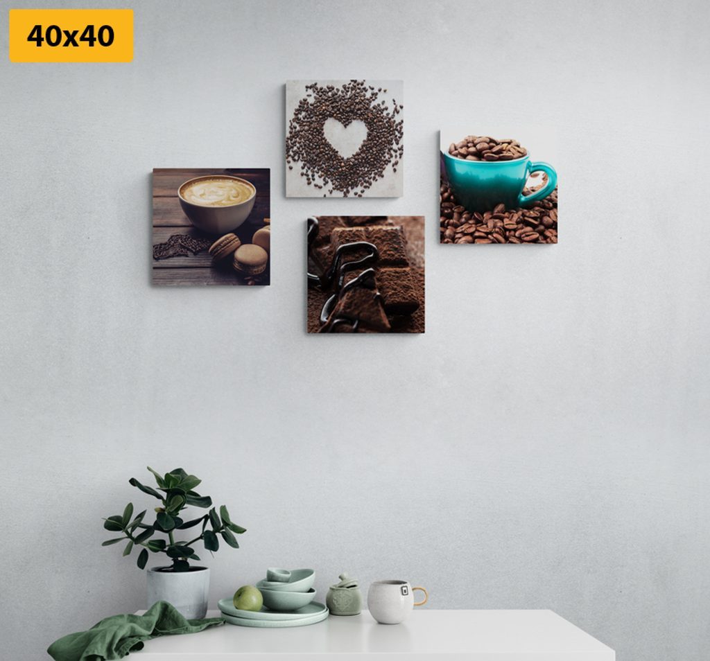 Výhody USP sety Čtyři obrazy laděné do podobných motivů a barev, Snadná instalace, Možnost umístění dle vlastních představ, Prémiové plátno 280 g/m²