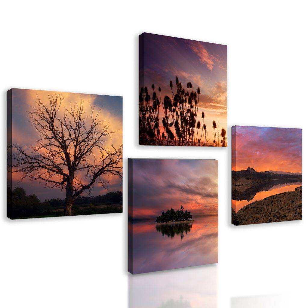 Výhody USP sety Čtyři obrazy laděné do podobných motivů a barev, Snadná instalace, Možnost umístění dle vlastních představ, Prémiové plátno 280 g/m²