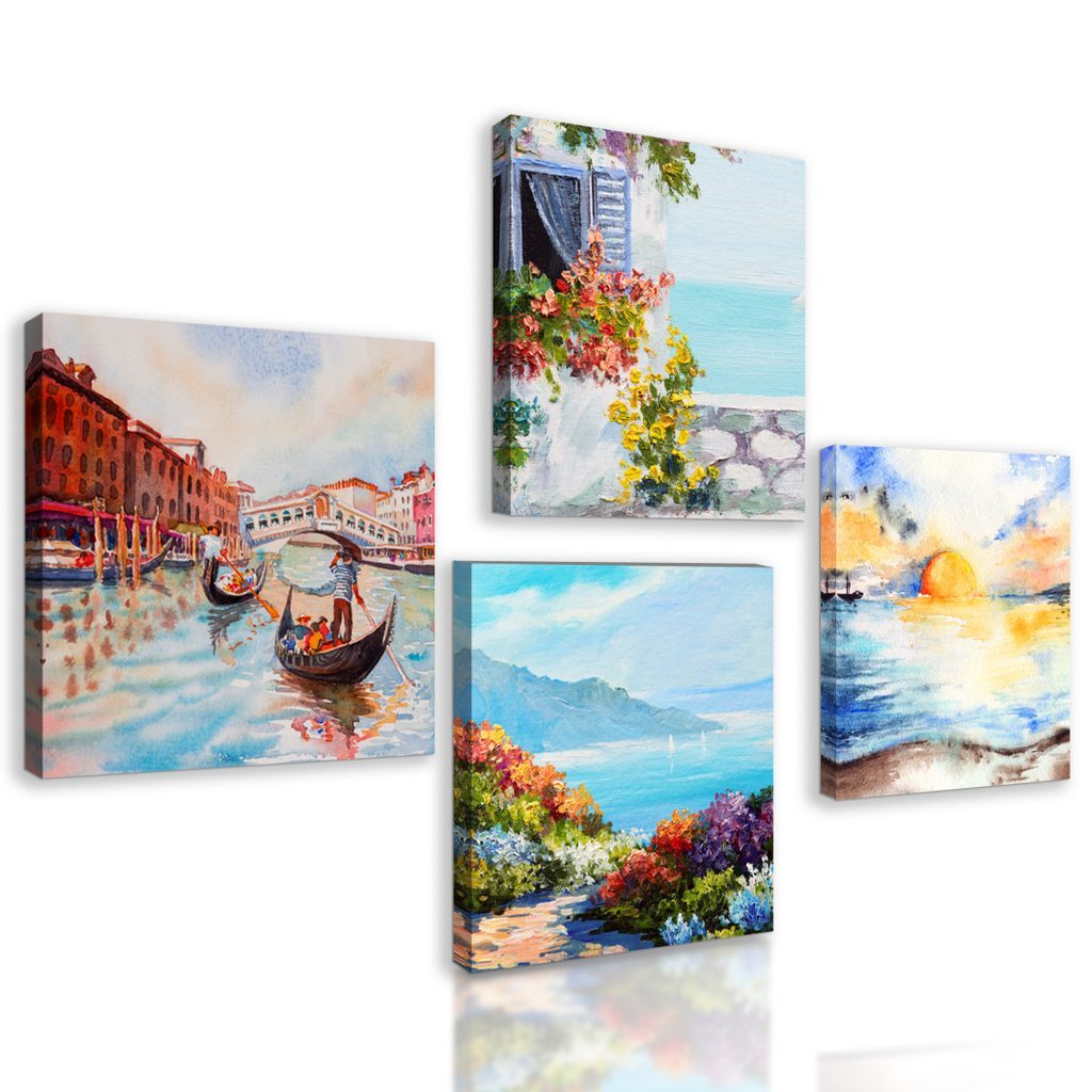 Výhody USP sety Čtyři obrazy laděné do podobných motivů a barev, Snadná instalace, Možnost umístění dle vlastních představ, Prémiové plátno 280 g/m²