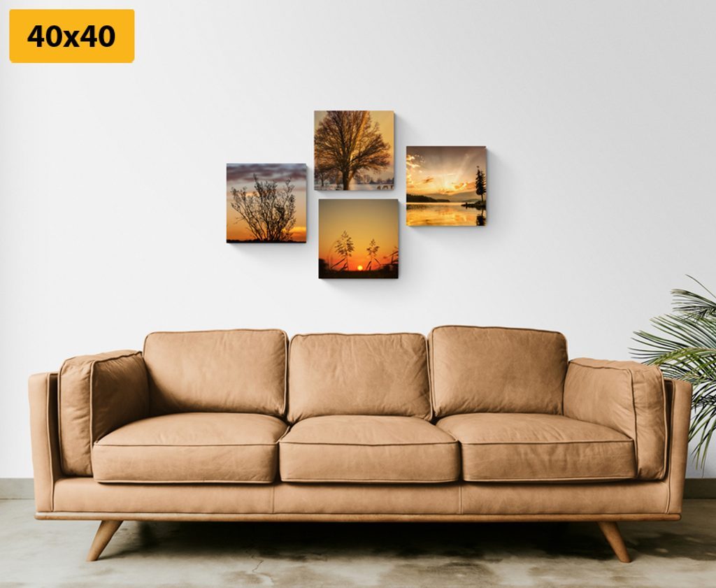 Výhody USP sety Čtyři obrazy laděné do podobných motivů a barev, Snadná instalace, Možnost umístění dle vlastních představ, Prémiové plátno 280 g/m²