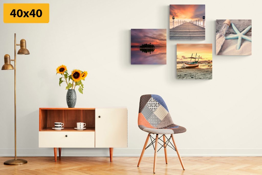 Výhody USP sety Čtyři obrazy laděné do podobných motivů a barev, Snadná instalace, Možnost umístění dle vlastních představ, Prémiové plátno 280 g/m²