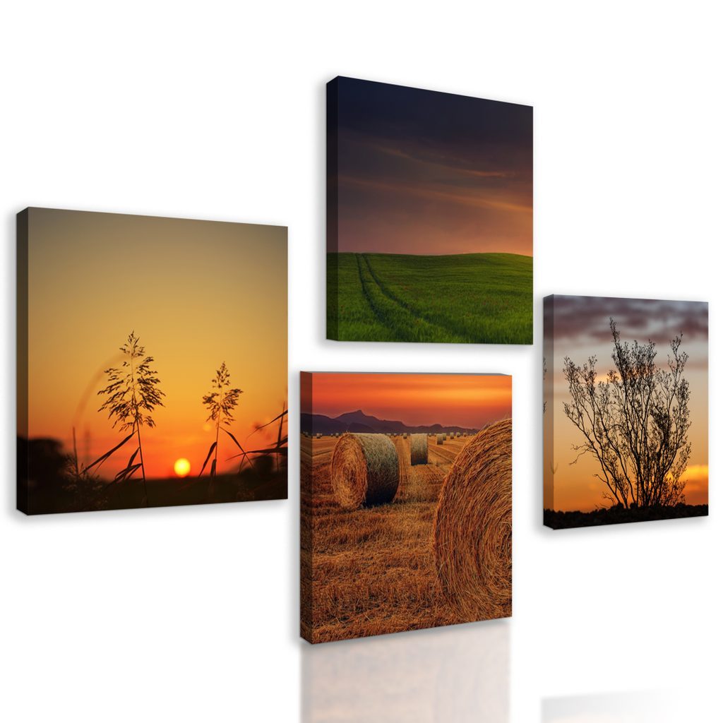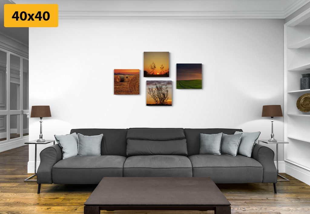 Výhody USP sety Čtyři obrazy laděné do podobných motivů a barev, Snadná instalace, Možnost umístění dle vlastních představ, Prémiové plátno 280 g/m²