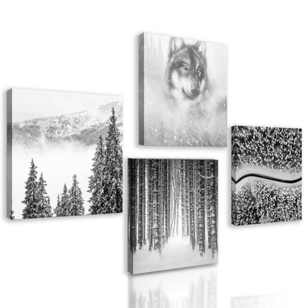 Set obrazů vlk v hlubokém lese v černobílém provedení