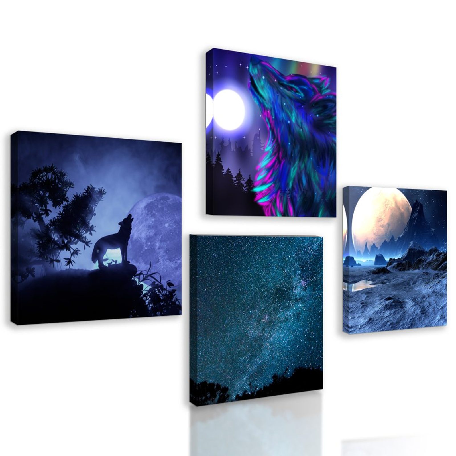 Výhody USP sety Čtyři obrazy laděné do podobných motivů a barev, Snadná instalace, Možnost umístění dle vlastních představ, Prémiové plátno 280 g/m²