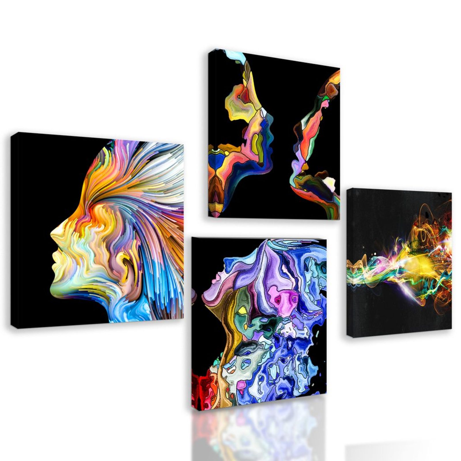 Výhody USP sety Čtyři obrazy laděné do podobných motivů a barev, Snadná instalace, Možnost umístění dle vlastních představ, Prémiové plátno 280 g/m²