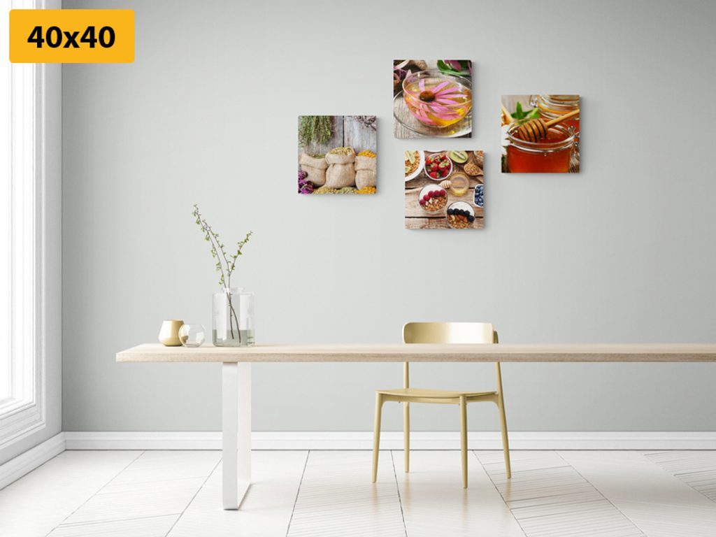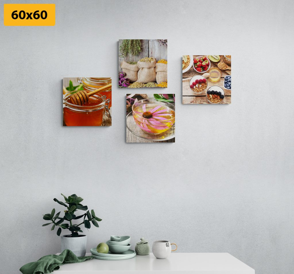 Výhody USP sety Čtyři obrazy laděné do podobných motivů a barev, Snadná instalace, Možnost umístění dle vlastních představ, Prémiové plátno 280 g/m²