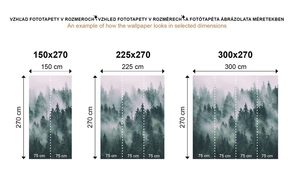 U variant vysokých 270 cm je motiv přizpůsoben konkrétním rozměrům, což může znamenat jeho mírné oříznutí. Po kliknutí na požadovanou velikost na e-shopu si můžete prohlédnout přesný náhled. I tyto tapety se skládají z 49 cm širokých pásů.