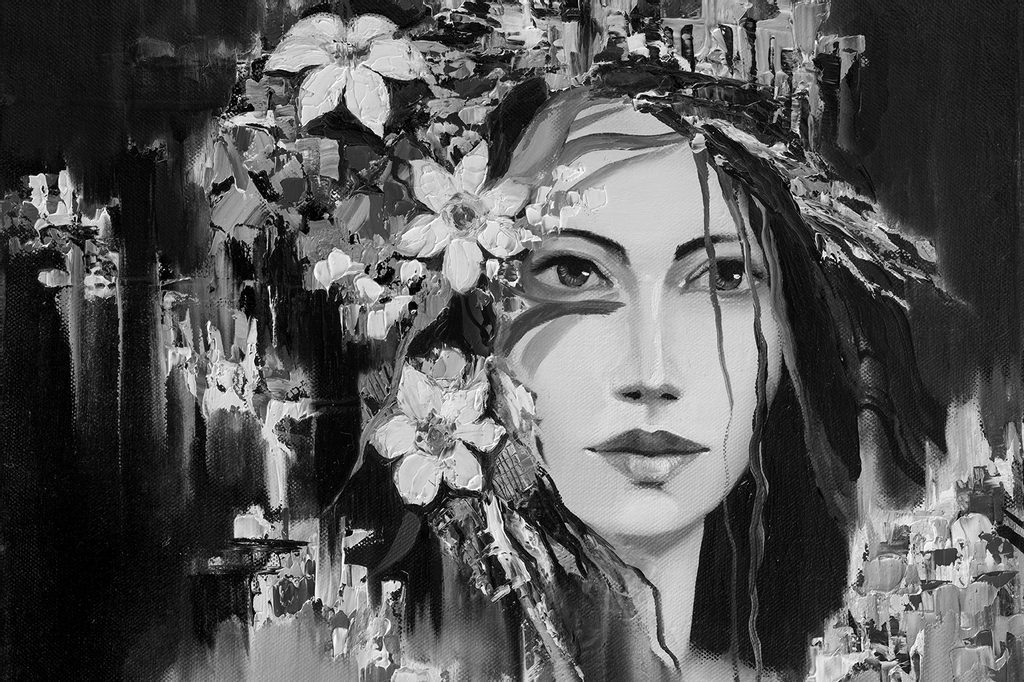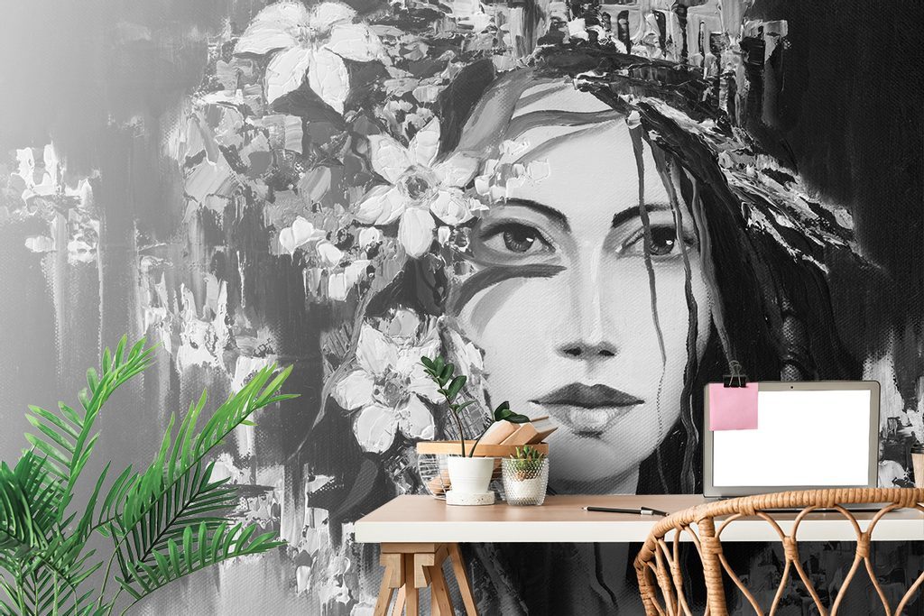 Tapeta černobílá malba dívky s květinami