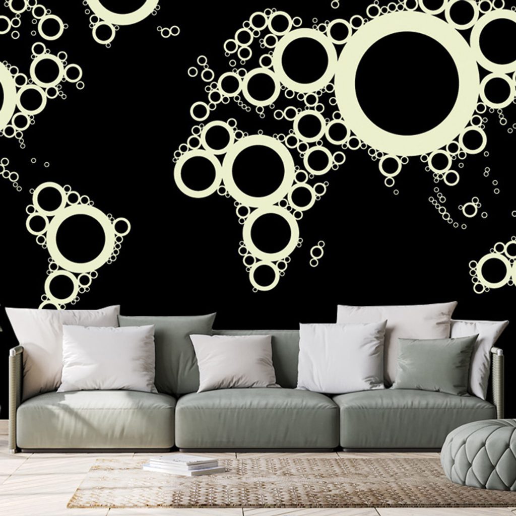 Tapeta mapa světa tvořená kružnicemi v černobílém provedení