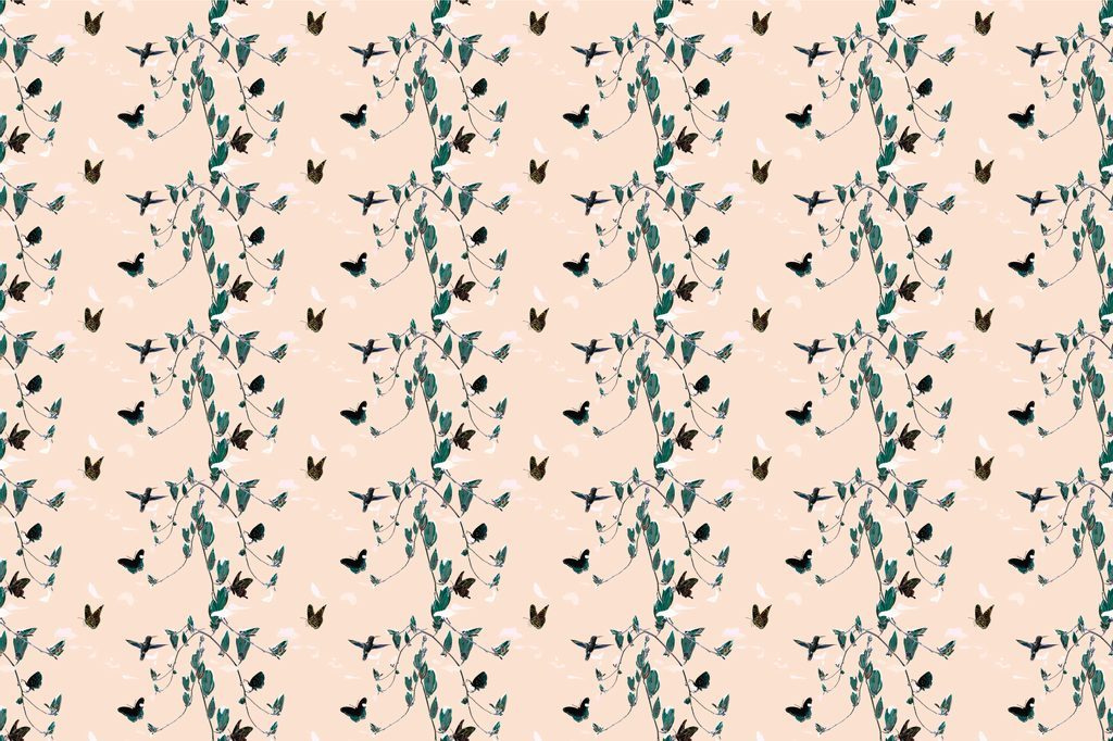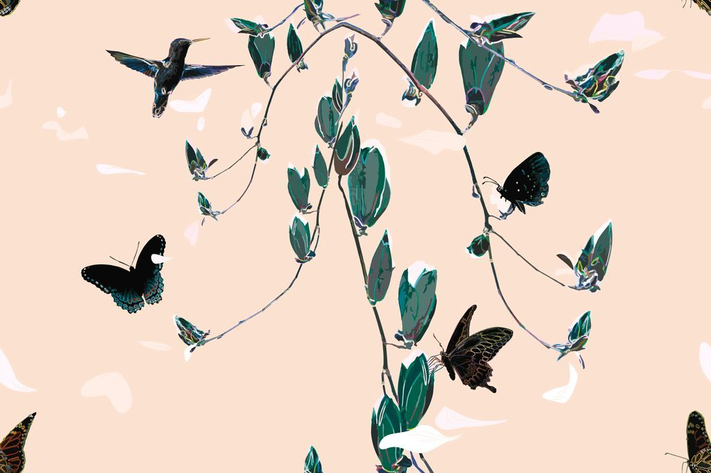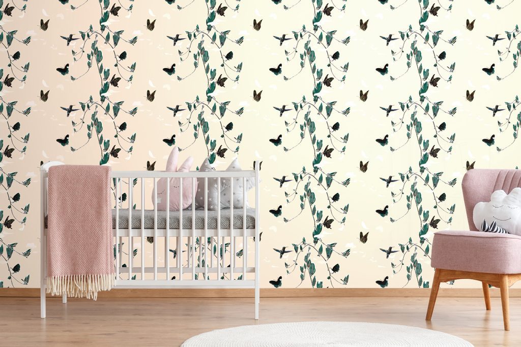 Samolepící tapeta ptáčci v šípkových keřích na béžovém pozadí