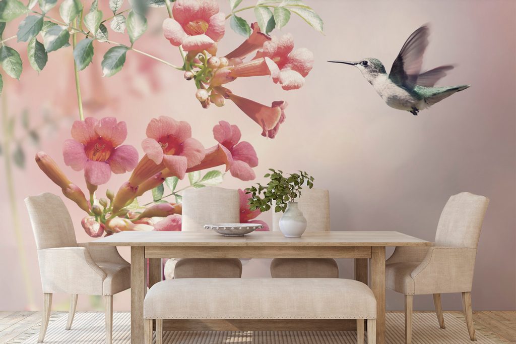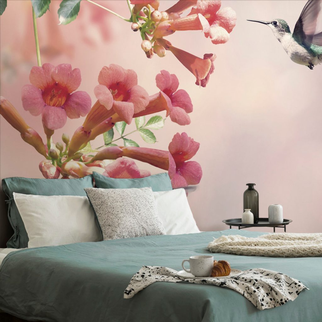 Samolepící tapeta ptáčci v šípkových keřích na růžovém pozadí