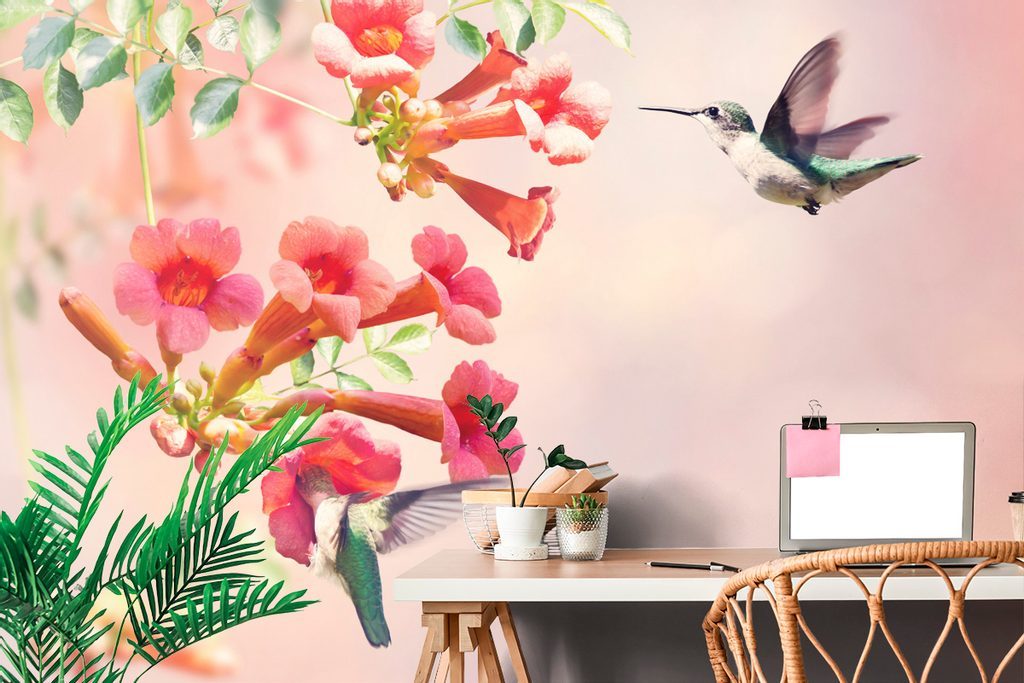 Samolepící tapeta ptáčci na větvích na růžovém pozadí