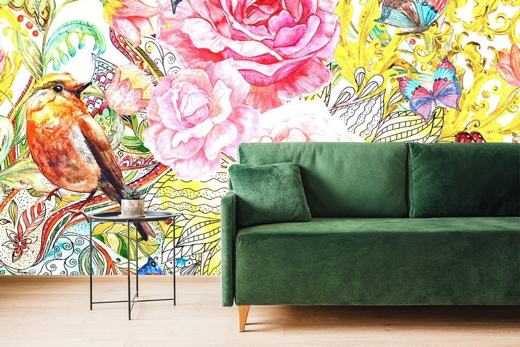 Tapeta ptáček s motýly ve vintage provedení