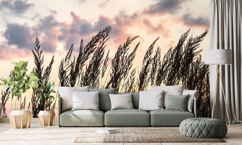 Zajímavá samolepící fototapeta stébla trávy při západu slunce
